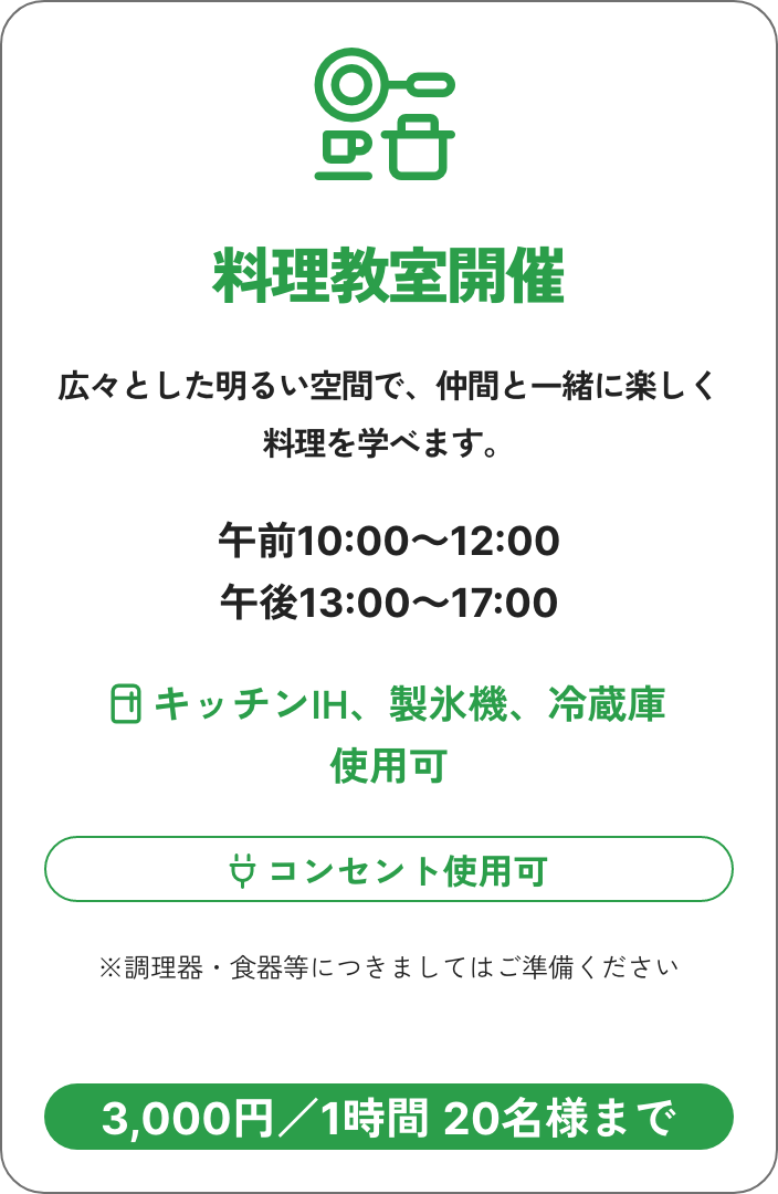 会議や打ち合わせ、習い事、料理教室にも対応し、持ち込みも自由です(アルコール不可)